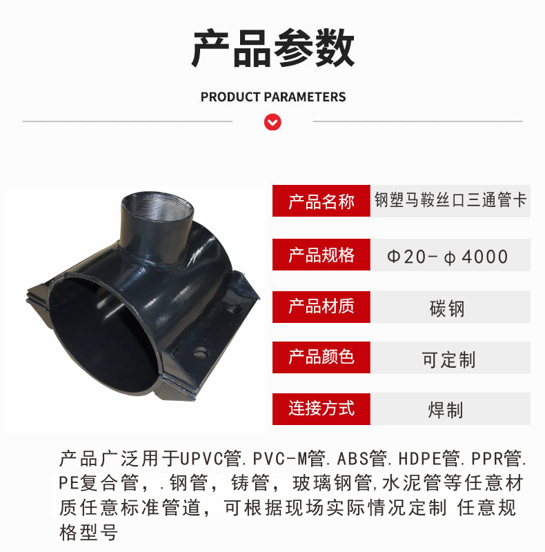4.本企業生產q235鋼和任意不銹鋼材DN15-DN4000各種規格適用于各種管道的三通哈夫節,規格型號,調劑本庫暫缺的規格,省去您奔波采購的辛勞。本企業生產哈夫節,搶修節有20多年,生產經驗豐富質量有,每批出廠的產品都經過壓力實驗和滲漏測試,客戶對每一件產品都滿意。