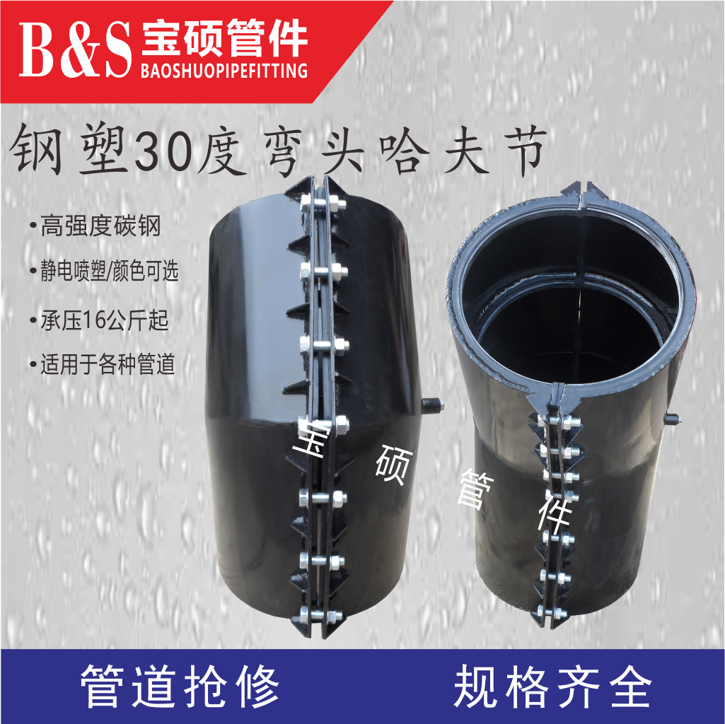 彎頭哈夫節(jié)用于管道彎頭部位出現(xiàn)砂眼、裂縫、斷裂的搶修。主要適用于鍍鋅管、鋼管、PE管、PVC管。