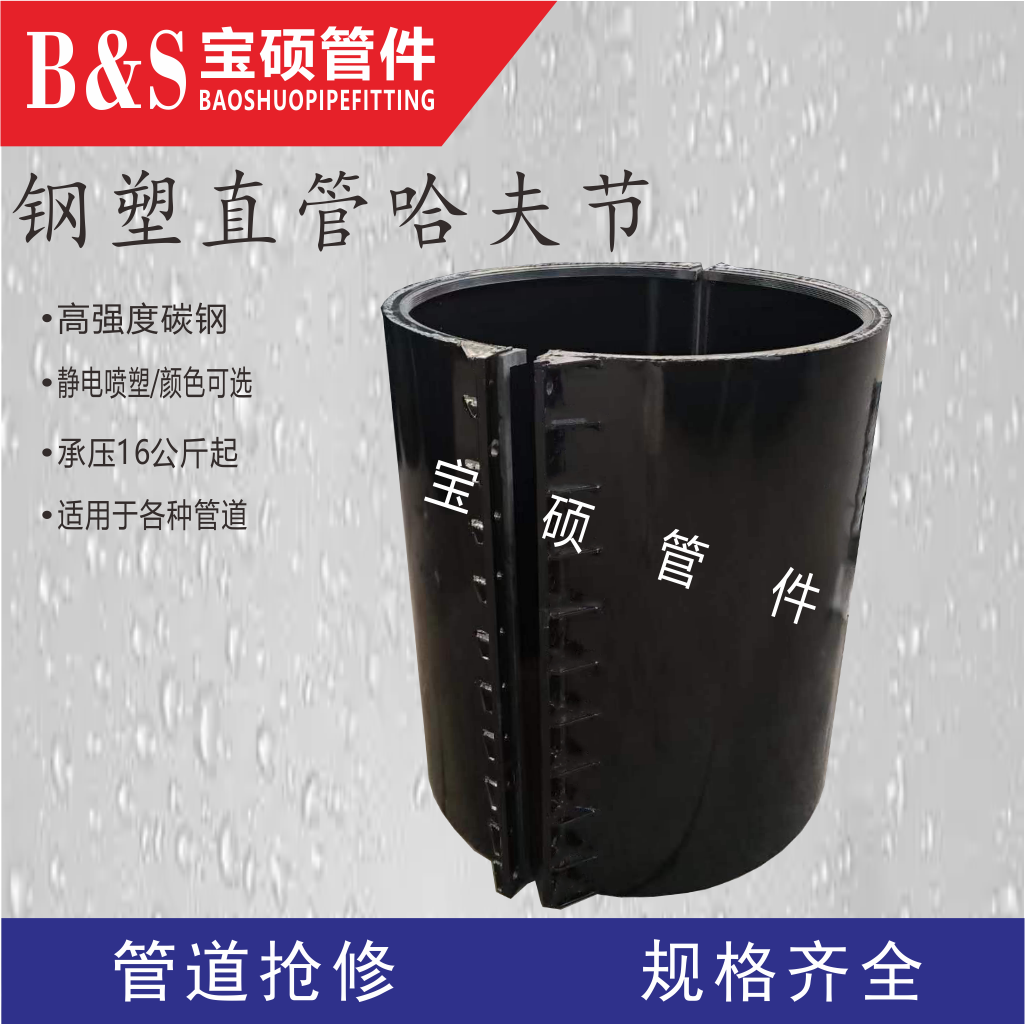 常州寶碩管件有限公司是一家專業(yè)生產(chǎn)各種管道哈夫節(jié)、三通哈夫節(jié)、彎頭哈夫節(jié)、異徑等管件哈夫節(jié),以及高壓哈夫節(jié)、耐油哈夫節(jié)、耐高溫哈夫節(jié)、耐腐蝕哈夫節(jié)、碳鋼哈夫節(jié)、304.316.316L不銹鋼哈夫節(jié)的公司。此外,該公司還生產(chǎn)馬鞍三通管卡、四通管卡、哈夫三通管卡、鋼塑管件、柔性快速接口等產(chǎn)品。