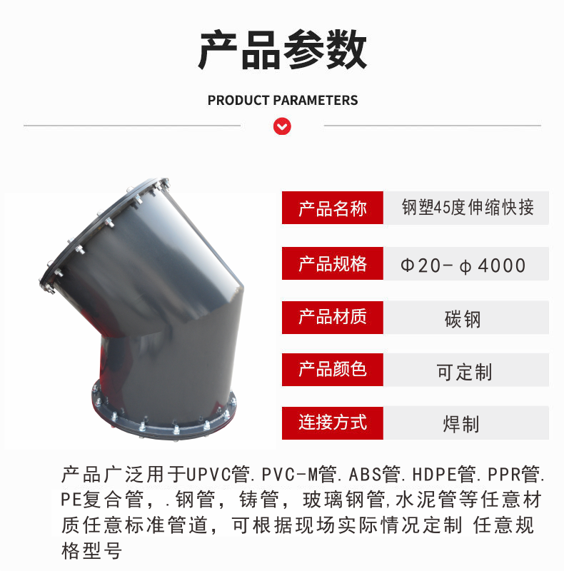 產品簡介: 45度螺桿式搶修接(搶修彎頭)(Φ20-Φ2000mm),適用于各種材質的管道,壓力大,耐腐蝕,施工方便,可定制美標、日標、英標等標準可定制任意長度,任意異徑管徑